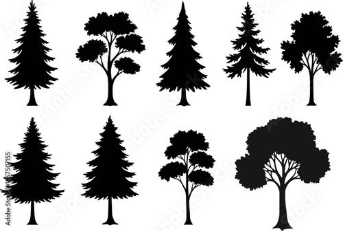 Minimal silhouette tree and cloud set Black and white vector illustration of stylized trees and cloud shapes