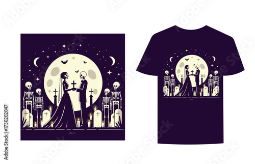 Minimal Skeleton Couple in Moonlit Graveyard – Gothic Halloween T-Shirt Design, Generative Ai