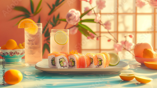 minimalism, Flatlay Food In The Table, sushi long tray, clean background, hard-edged salt gouache, freestyle gestural art, warm bright pink and blue tones, romantic warm feeling artwork, cool color pa