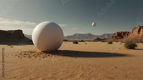 Minimalist 3D desert scene with floating white sphere.