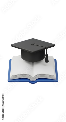 Minimalist 3D Icon of Academic Success Black Mortarboard on an Open Blue Book.