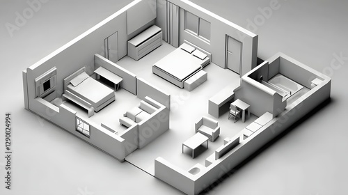 Minimalist 3D Interior Design Model Featuring Bedroom and Living Space Layout in White