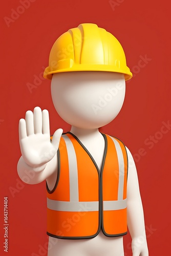 Minimalist 3D white figure in a safety vest and helmet, holding a red stop warning sign, representing a construction worker, engineer, or architect on a red background