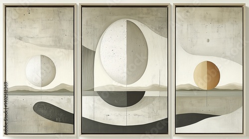 Minimalist Abstract Triptych of Geometric Sun and Moon Over Landscapes Ideal for Modern Home Decor or Contemporary Wall Art Displays