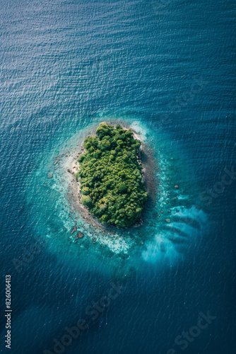 Minimalist aerial view of a small island surrounded by a vast expanse of blue sea, highlighting the isolation and simplicity.