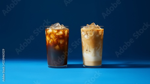 Minimalist and Vibrant Layout with Two Clear Glasses Filled with Iced Coffee Beverages, Glass Dark Black Iced Coffee with Visible Ice Cubes and Creamy Texture, Soft Blue Background and Surface