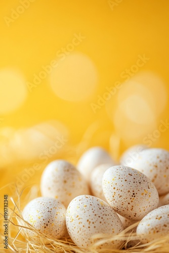 Minimalist Arrangement of Decorative Eggs Nestled in Straw Against a Vibrant Yellow Background for a Cheerful Celebration of Easter and Spring Festivals