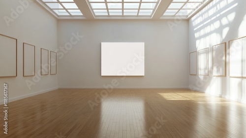 Minimalist art gallery interior with blank canvas against bright windows and wooden floor creating a spacious atmosphere for creativity