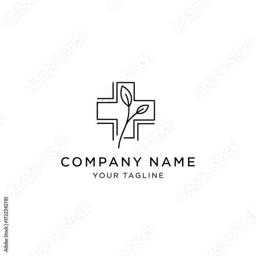 Minimalist Art Logo Design for Natural Health and Wellness, Featuring a Medical Cross Integrated with a Botanical Leaf Symbol., Flat Vector Elements, Vector Illustration, Simple Vector, Stylized