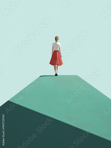 Minimalist Artwork of Woman in Red Skirt Walking on a Green Platform with Blue Background