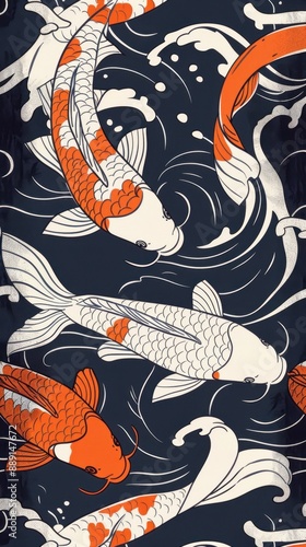 Minimalist Asian pattern, koi fish and waves, flat design illustration