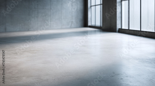 Minimalist, atmospheric image of an empty concrete room with large windows. Soft light creates depth. Perfect background for product shots or conceptual art.