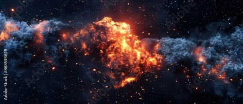 Minimalist banner featuring a dramatic stellar explosion with glowing fragments with copy space