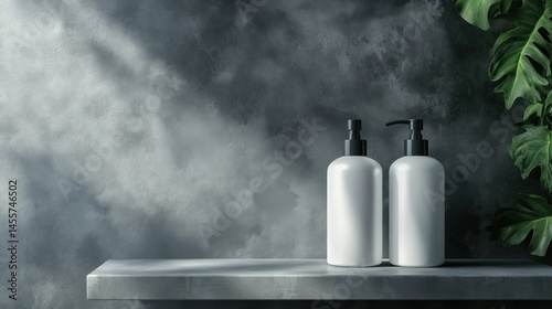 Minimalist Bathroom Countertop with Two White Soap Dispensers and Green Plant in Modern Interior Design for Relaxing Home Spa Environment