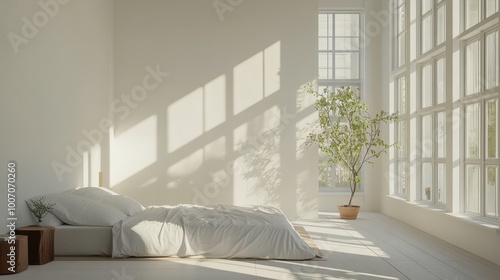 Minimalist bedroom design with a clean aesthetic, featuring simple furnishings and natural light