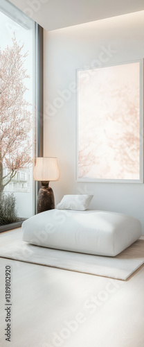 Minimalist bedroom with large window showcasing a tranquil outdoor view