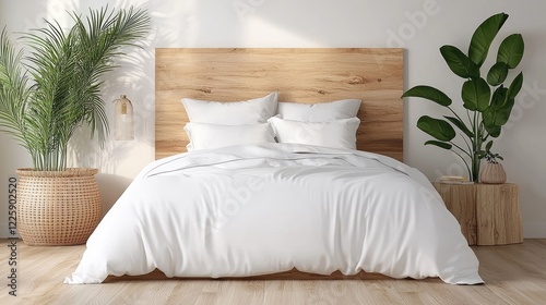Minimalist bedroom, wooden headboard, plants, sunlight, calm interior, home decor