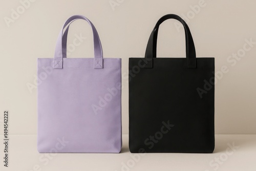 Minimalist black and lilac tote bags side by side on neutral background ideal for fashion branding and eco friendly packaging