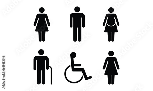 Minimalist black and white bathroom and accessibility icon set featuring male, female, pregnant, elderly, and wheelchair symbols