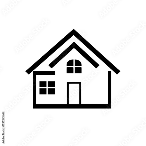 Minimalist Black and White House Icon: Simple geometric design depicting a dwelling with a gabled roof, windows and a door.