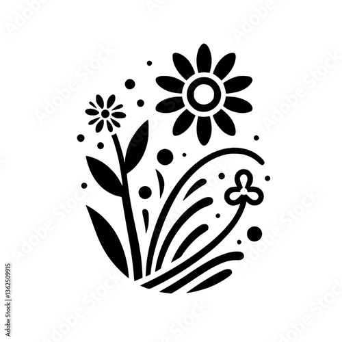 Minimalist black and white illustration depicting stylized flowers and foliage, creating a decorative floral emblem on a clean white background.