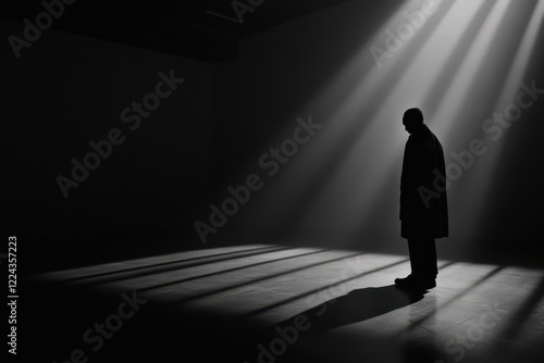 Minimalist black and white scene of a man with parallel lines, dramatic shadows, and lighting