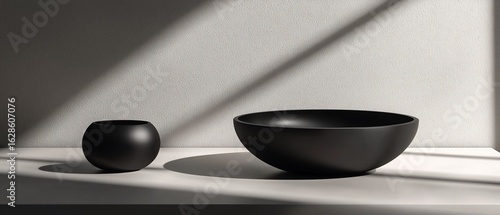 Minimalist Black Bowls and Shadow Play on Textured White Wall