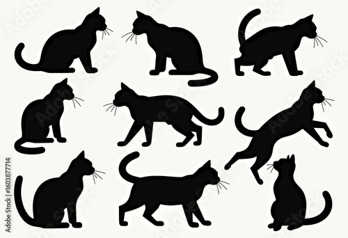 Minimalist Black Cat Silhouettes Seamless Pattern Vector Illustration in Various Playful Poses, Ideal for Feline-Themed Home Decor, Digital Art Projects, or Animal Lover Merchandise Designs, Adding a