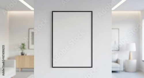 Minimalist Black Frame Mockup on White Wall in Bright Modern Interior.