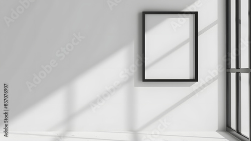 Minimalist black frame on a white wall: a simple and elegant empty picture frame ready for artwork or photography display in a modern interior.