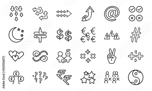 Minimalist Black Line Symbol Icons Bundle – Currency, Arrows, Social, Love, Checkmarks, Peace, Hashtag, Moon, Star, Plus Minus, People & Abstract Shapes in Silhouettes Style on White Background
