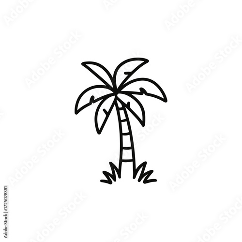 Minimalist black outline of a palm tree, showcasing its distinctive leaves and trunk, on a white background. This vector illustration is ideal for use in tropical-themed designs and projects.