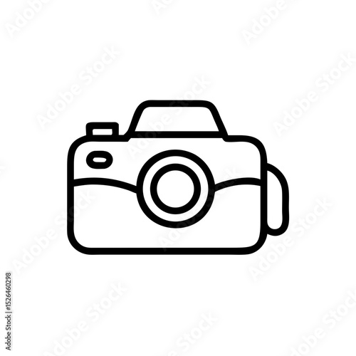Minimalist black outline vector icon of a camera with lens and strap, symbolizing photography, travel, and tourism in a clean and simple design