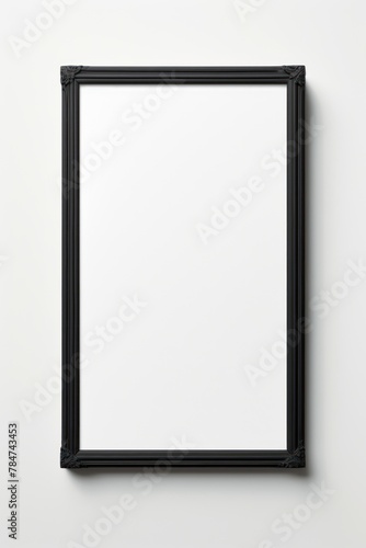 Minimalist black picture frame against white backdrop. Elegant black frame with corner details. Copy space. Concept of simple elegance, gallery aesthetics, modern interior design. Mockup. Template