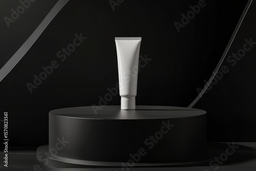Minimalist black podium stage showcasing a white cosmetic tube against a dark backdrop
