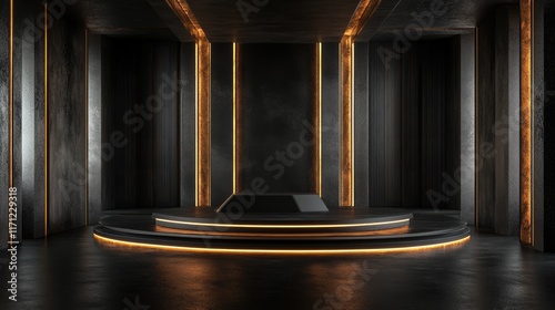 Minimalist black stage with a central podium spotlighted by warm gold lights, crafted with AI technology.