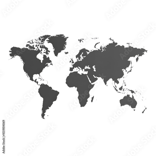 Minimalist black world map silhouette on a plain white background showing continents and landmasses