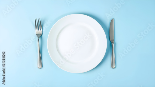 Minimalist blue plate with fork and knife on a clean, modern background. Generative AI
