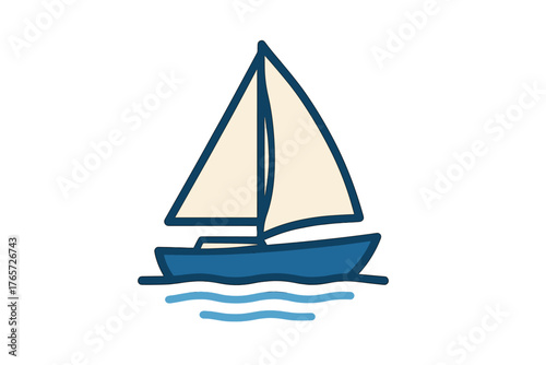 Minimalist blue sailboat icon with white sails floating on gentle ocean waves