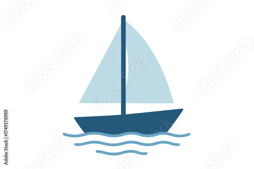 Minimalist blue sailboat sailing on stylized wavy water isolated on a white background