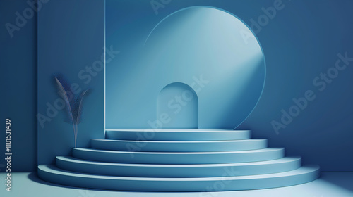 Minimalist Blue Stage with Modern Lighting and Palm Leaf Illustration for Interior Design Inspiration