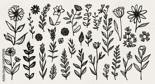 Minimalist botanical line art collection with flowers and leaves on plain white background