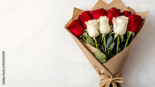 Minimalist bouquet of red and white roses wrapped elegantly in natural paper on a neutral background