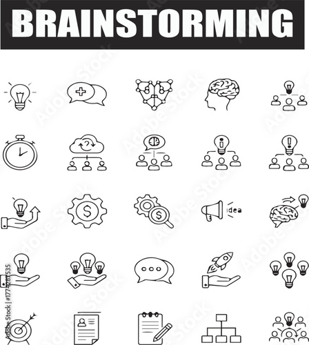 Minimalist Brainstorming Icons Collection — Creativity, Problem Solving, and Team Ideas Outline Set.