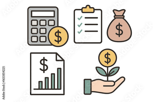 Minimalist business finance and money management icons set. Calculator, checklist, money bag, financial growth graph, investment, budgeting, savings, and planning symbols. Vector illustration.