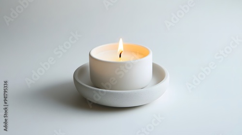 Minimalist Candle: A small, plain white candle in a minimalist holder, centered on a white background, with a faint shadow for depth.