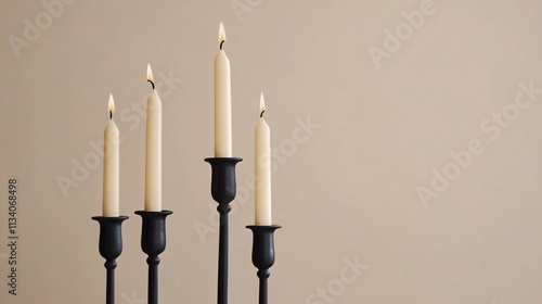 Minimalist candlesticks in black iron, holding ivory candles, set against a soft beige backdrop