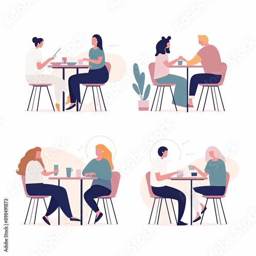 Minimalist character illustrations in Notion style, white background, with a group of people sitting at a table