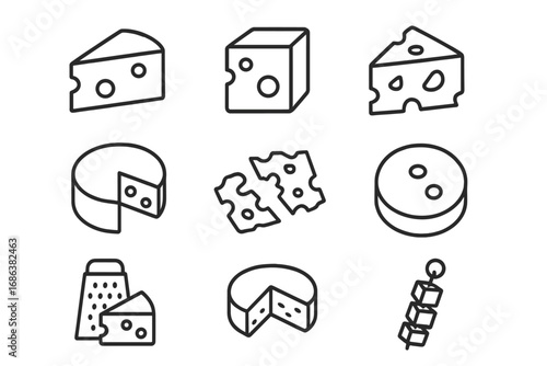 Minimalist Cheese Icon Set Vector Collection. Swiss Cheese Slice, Grated Cheese, Cheese Wheel, Cubes, Cartoon Doodle Outline. Dairy Food Pictogram for Web, App, Recipe, Restaurant, Market, Banners