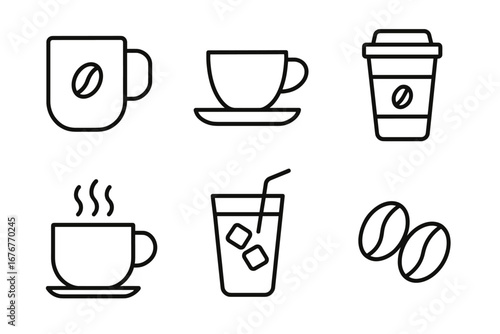 Minimalist coffee icon set: cups, beans, and cold brew designs